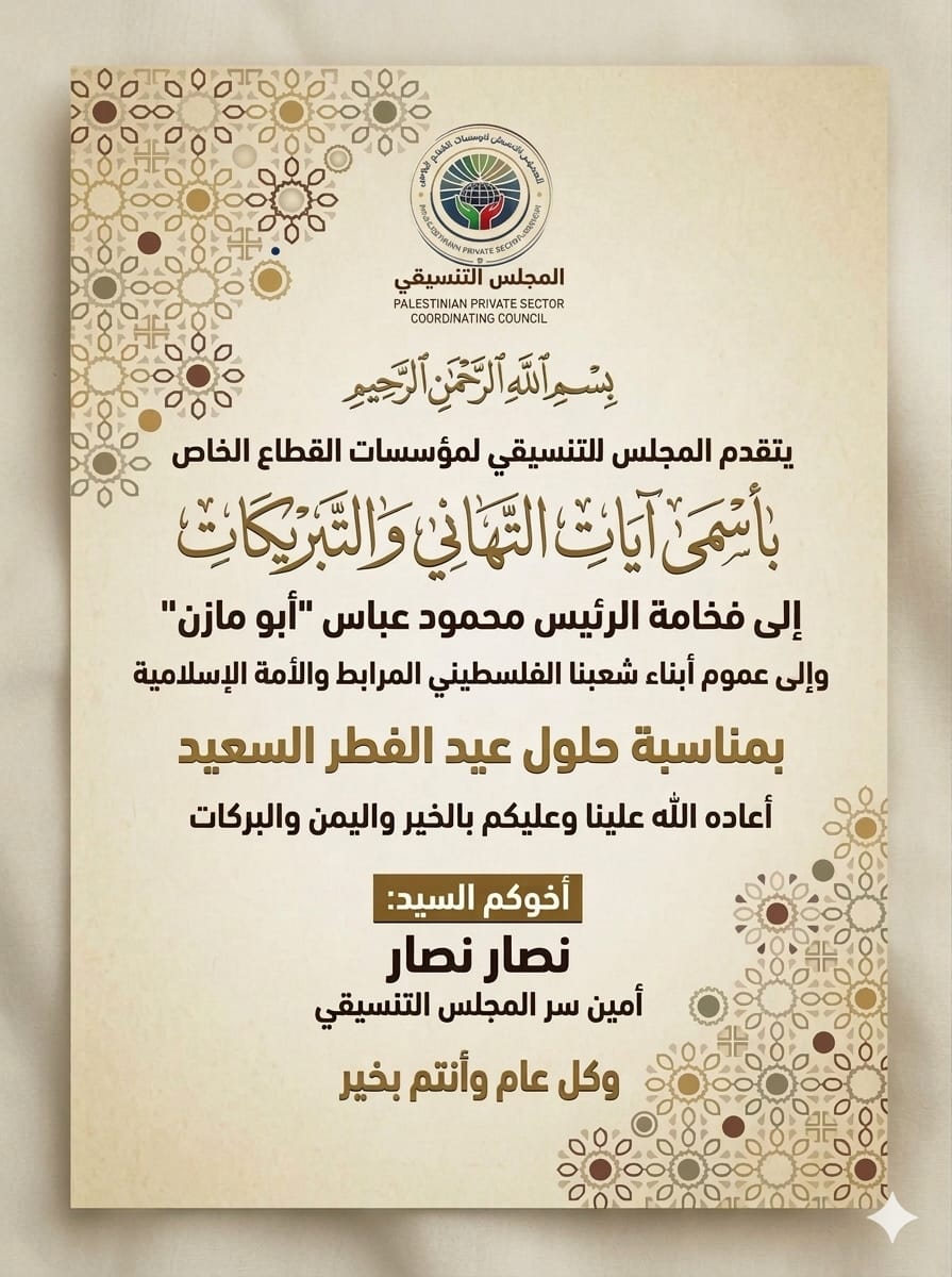 أعلن أمين سر المجلس التنسيقي لمؤسسات القطاع الخاص والاتحاد العام للصناعات الفلسطينية، السيد نصار نصار، عن تقديم دعوى قضائية بتاريخ...